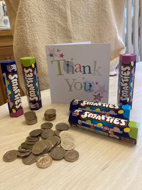 A brilliant way of raising money for International Charities! Rosemary Wilson generously sent us all a box of Smarties, which we clearly enjoyed eating, as we either soon returned our empty box filled with coins or sent a donation. Rosemary raised the amazing sum of £424.50 for ‘School in a Bag’ and other International Charities. Congratulations!