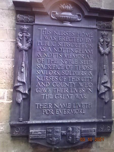 Nottingham Hospital in Royal Standard Place. The War Memorial for soldiers, sailors and nurses, who died in the 1st World War, 1914/18. The hospital became a Nurses’ Home and more recently was sold as flats.