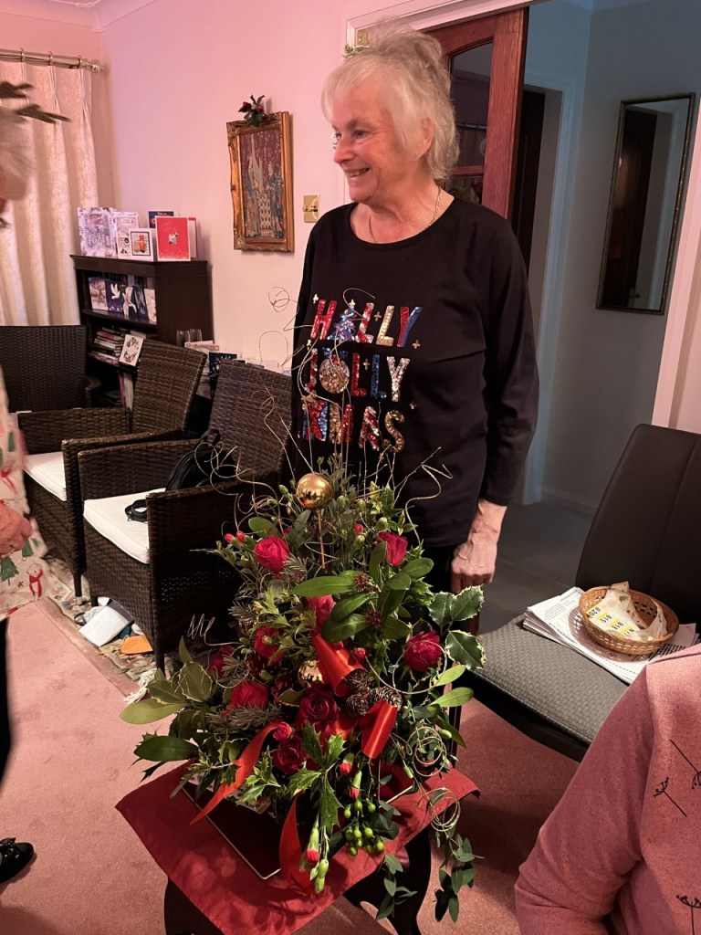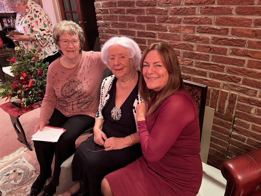 Inner Wheel ladies are always busy even when they are at a partyVeronica made two amazing Christmas cakes to raffle off for funds for Bellamy Road AssociationKathy provided a sumptuous buffet and members gave a donation for Kathy’s chosen charity Margaret and Pauline enjoying the evening with Hazel looking happy she won the Raffle of a Christmas cake and bottle of sherry. The other cake was won by Sara StathamRosemary made a magnificent flower arrangement as a thank you from the Club for providing such a lovely venue for our Christmas meetingMum & daughter enjoying being fellow members of Inner Wheel!