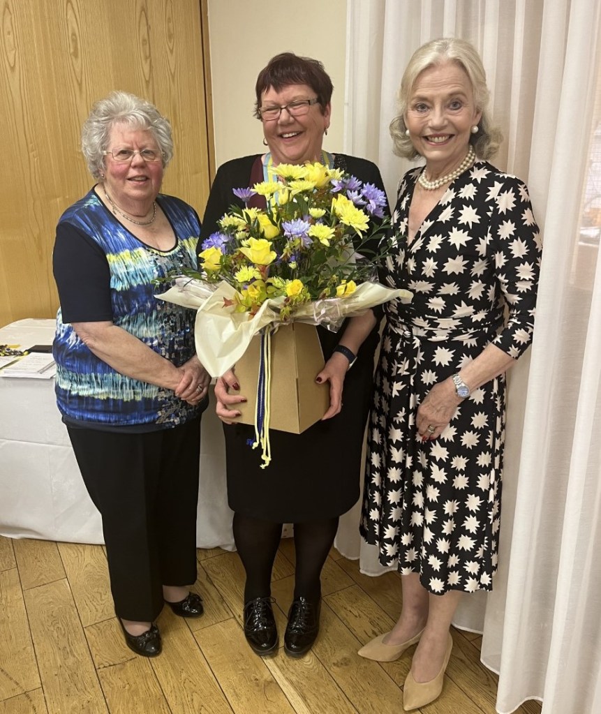 Our District Chairman Elaine Hopkins joined us for our April meeting and entertained us with stories of her life before joining Inner wheel. We were also inspired by her commitment to bringing in new members to Inner Wheel, reminding of us of the good work the organisation does and the funds that are distributed to needy causes throughout the world. Past District Chairman Yvonne gave the vote of thanks and Kathy presented Elaine with a lovely flower arrangement in Inner Wheel colours.