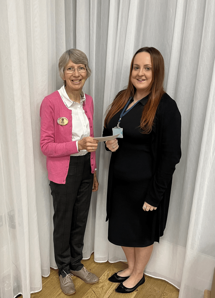 Immediate Past President Kathy Winson accepts a cheque for £500 on behalf of Pancreatic Cancer which was her nominated charity last year
