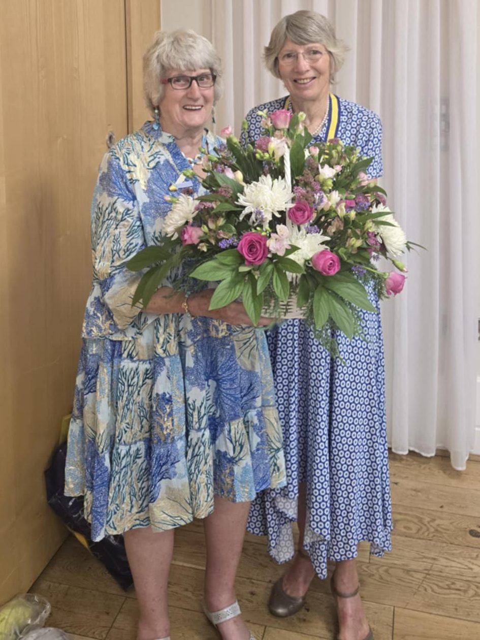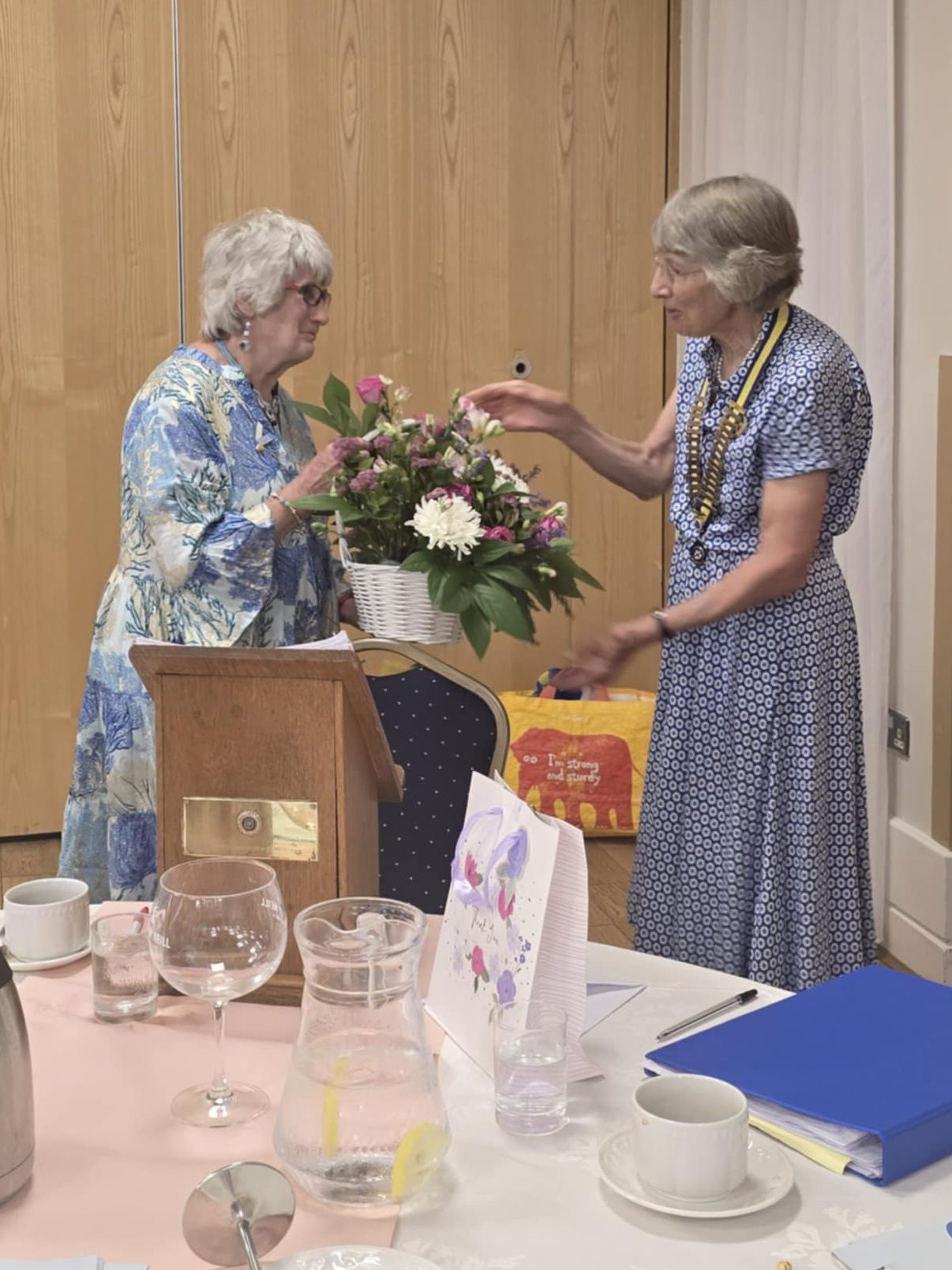 And so on to the next Inner Wheel Year. Jenny inducted Dain. president of the Inner Wheel Club of Mansfield for the year 2025 to 2026. Dain thanked Jenny for all she had done and presented her with a gift and flower arrangement from the Club.